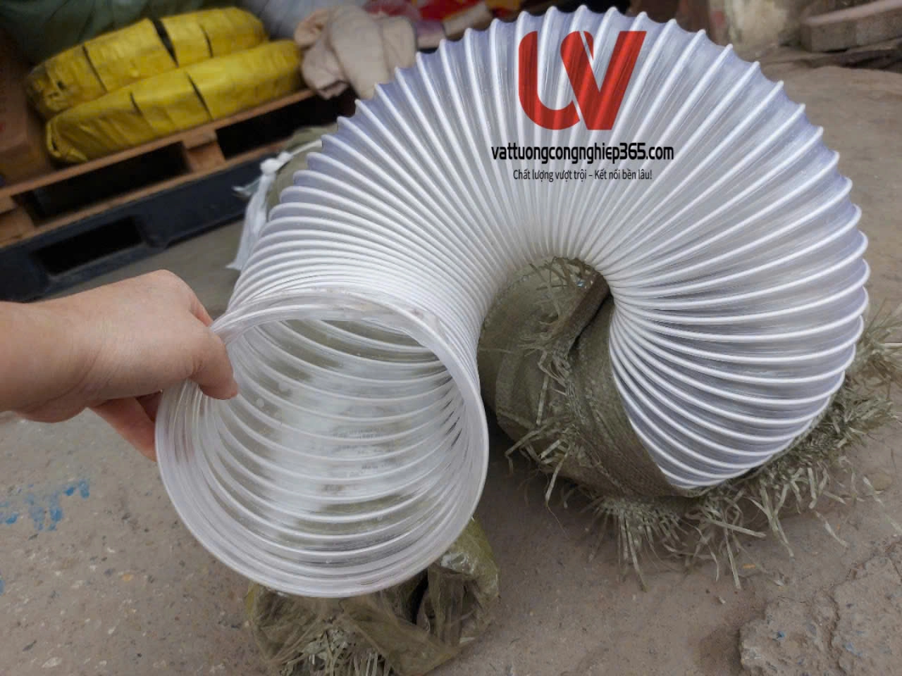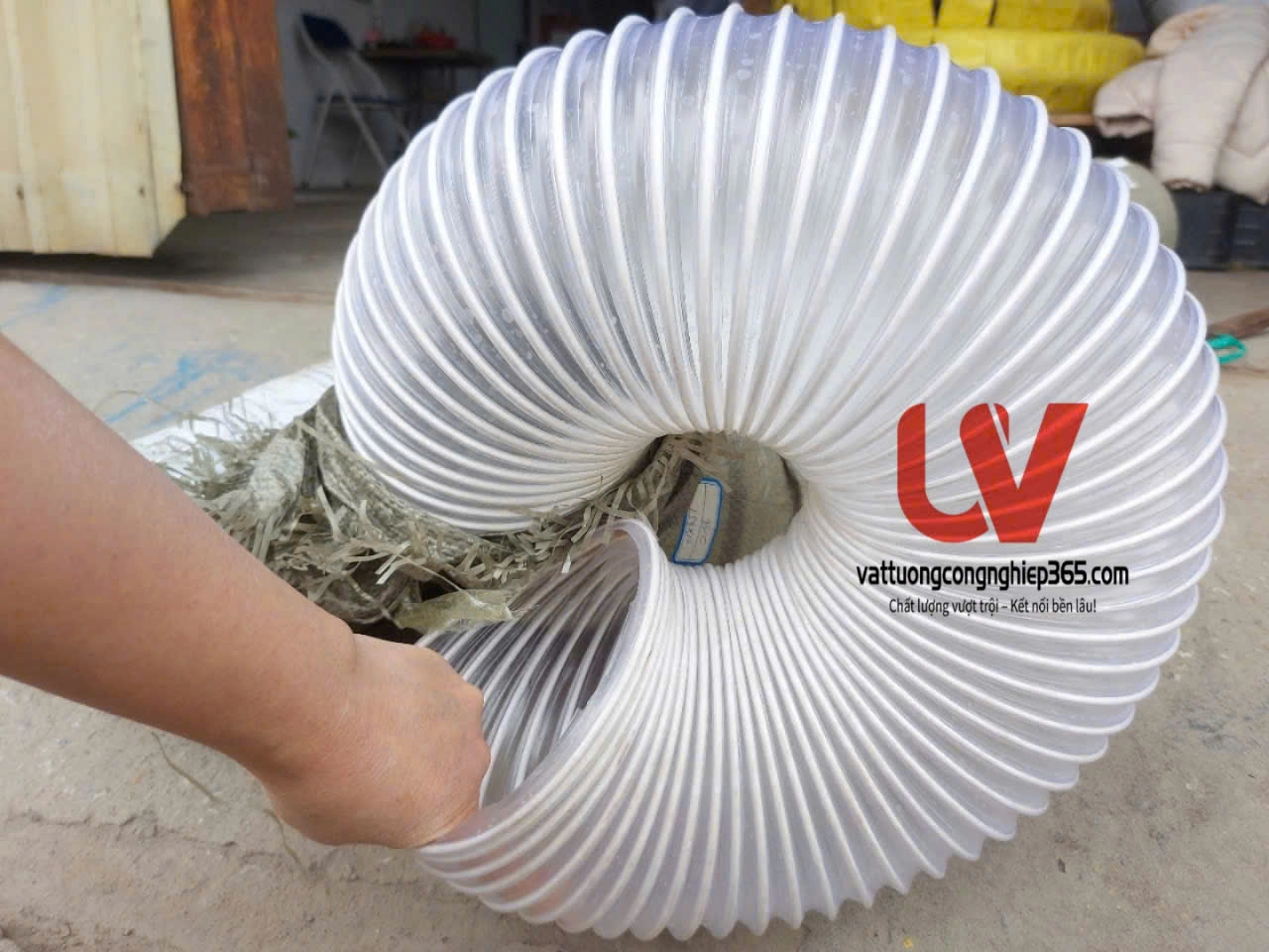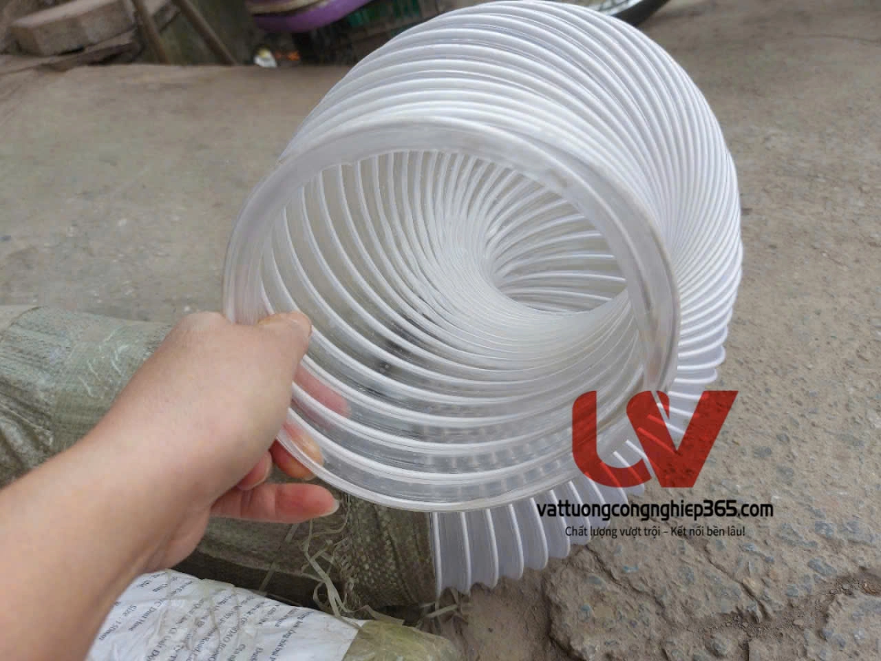 Ống hút bụi lõi thép phi 125 hay còn được gọi với tên: Ống hút bụi co giãn đàn hồi, ống gió bụi trắng, ống hút bụi lõi thép bọc nhựa, ống lò xo lõi thép.